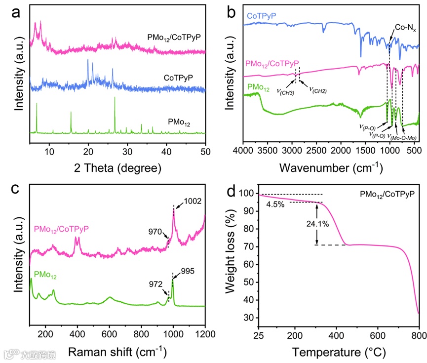 以POMs团簇和卟啉为结构单元,十六烷基三甲基溴化铵 (CTAB) 为表面活性剂,制备了一系列POMs/卟啉杂化纳米材料。TEM和HRTEM图像显示杂化纳米材料中产生了大量sub–1 nm有序通道,与PMo12团簇的大小一致。如HAADF–STEM图像所示,可以清楚地观察到层状结构。由于PMo12团簇的原子质量大,明暗交替的结构分别对应于CoTPyP和PMo12。此外,一系列表征证实了PMo12团簇在杂化纳米材料中保持完整,且PMo12与CoTPyP存在强相互作用。