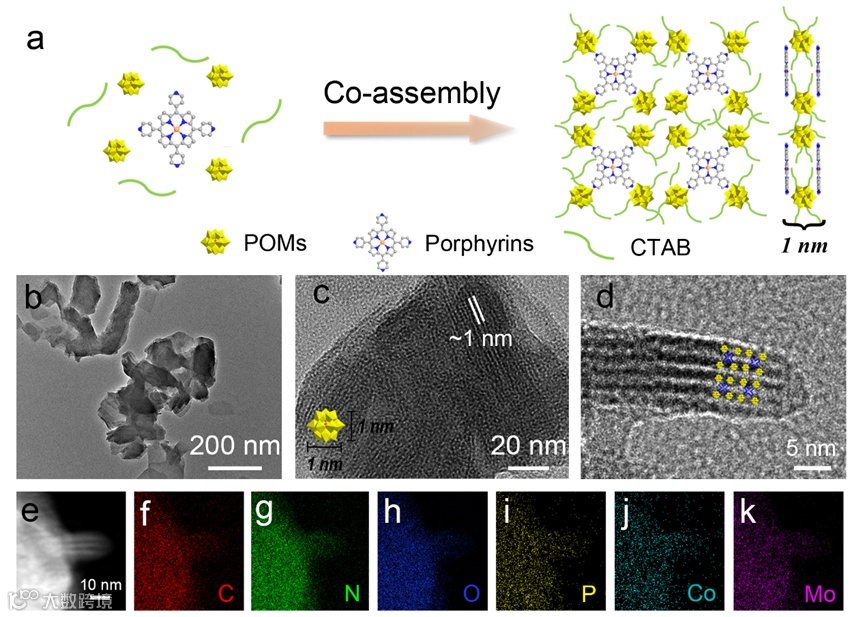 PMo12/CoTPyP的 (b) TEM图像,(c) HRTEM图像,(d) HAADF–STEM图像和 (e-k) 元素mapping图像