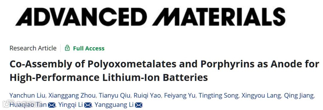 近日,来自东北师范大学的李阳光教授、谭华桥教授,李英奇副教授,在国际知名期刊Advanced Materials上发表题为“Co-Assembly of Polyoxometalates and Porphyrins as Anode for High-Performance Lithium-ion Batteries ”文章。文章通过溶剂热方法将POMs和卟啉进行共组装合成了一系列新型杂化纳米材料,实现了POMs和卟啉单元的均匀分散。这项工作为合成同时具有高分散性、氧化还原活性和稳定性的POMs基负极材料铺平了策略。