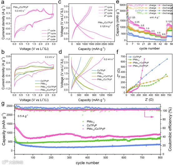 测试结果显示,与CoTPyP、PMo12和PMo12+CoTPyP相比,PMo12/CoTPyP表现出最高的放电容量,0.125 A g–1的电流密度下的放电比容量达到1398 mAh g–1,并在随后的循环中显示出优异的循环稳定性和库仑效率。
