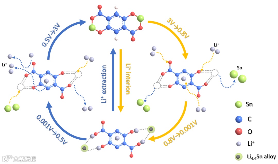 借助非原位的XRD和XPS等先进的表征技术,对Sn-MOF的储锂机制进行了深入探究。研究结果表明,Sn-MOF之所以展现出优异的储锂性能,主要归因于以Sn核为中心的合金化反应、有机配体的固有氧化还原相互作用以及有机分子间发生的复杂超锂化反应。这些相互作用,共同促进了锂离子的嵌入与脱出过程,从而实现了高效的锂存储。通过原位EIS测试和GITT分析。发现MXene@Sn-MOF复合材料的电子转移性能得到了显著增强,这主要得益于MXene纳米片的高导电性。同时,复合材料还加速了反应产物与电解质之间的离子交换,从而提高了锂离子的扩散速率。