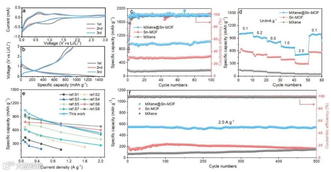 对MXene-Sn-MOF复合材料进行了一系列的表征和电化学性能测试。实验结果显示,Sn-MOF能够均匀且紧密地锚定在MXene纳米片的表面,这一结构特点显著增大了材料的比表面积,进而为锂离子提供了更多的活性位点,有效提升了材料的储锂容量。在0.1 A g-1的电流密度下,该复合材料经过100次循环后展现出高达1009 mAh g-1的可逆存储容量,即使在高达2 A g-1的电流密度下,MXene@Sn-MOF复合材料在经历500次循环后仍能维持540 mAh g-1的可逆比容量,这一结果充分证明了其卓越的倍率性能和循环稳定性。
