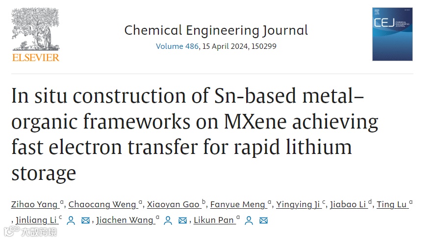 Zihao Yang, Chaocang Weng, Fanyue Meng, Yingying Ji, Jiabao Li, Ting Lu, Jinliang Li,* Jiachen Wang *, Likun Pana*, In situ construction of Sn-based metal-organic frameworks on MXene achieving fast electron transfer for rapid lithium storage,Chemical Engineering Journal, 2024, 486, 150299
