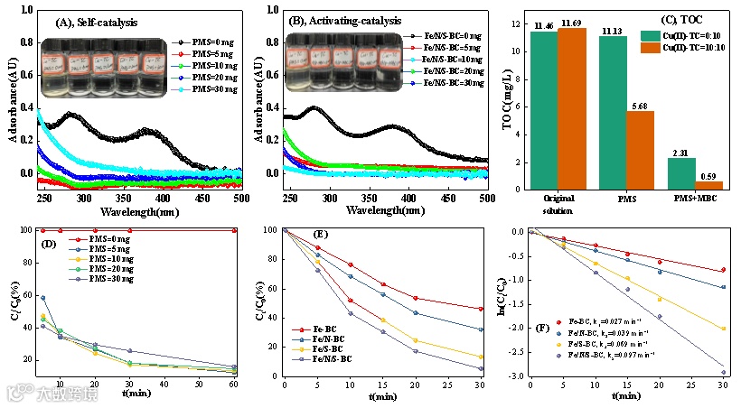在前期研究的基础上,本实验以FeCl3·6H2O为磁性前驱体,甘蔗渣纤维为炭源,尿素、硫脲和硫酸铵为掺杂剂,采用浸渍-热解法合成了Fe-BC、Fe/N-BC、Fe/S-BC和Fe/N/S-BC等一系列杂原子掺杂的生物炭。通过以下四部分内容研究Cu(II)-TC-TRST三元污染物的协同净化性能与机制:1,通过Cu(II)/PMS体系探索了水体铜配合物的可能构型及其对TC的均相自催化降解作用;2,研究Fe/N/S-BC/PMS体系对TC的非均相催化降解性能及机理;3,通过耦合Cu(II)/PMS和Fe/N/S-BC/PMS体系揭示Cu(II)-TC-TRST三元污染物中TRST的失活性能及机理;4,在养殖废水处理中的实际应用。