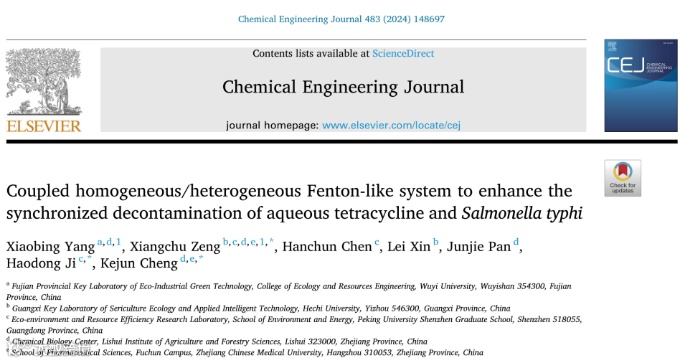 文献信息:Xiaobing Yang, Xiangchu Zeng, Hanchun Chen, Lei Xin, Junjie Pan, Haodong Ji, Kejun Cheng. Coupled homogeneous/hetrogeneous Fenton-like system to enhance the synchronized decontamination of aqueous tetracycline and Salmonella typhi. Chemical Engineering Journal, 2024, 483, 148697.