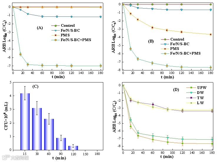 含重金属、抗生素和耐药细菌(ARB)的水体化学-生物协同污染对生态环境造成了诸多危害。本文提出了一种创新的降解—失活机制和一种耦合均相/非均相类Fenton体系,以协同净化水体四环素(TC)和耐TC伤寒沙门氏菌(TRST)。研究结果表明:在均相Cu(II)/PMS体系中,共存的微量Cu(II)与TC形成的铜配合物活化过氧一硫酸盐(PMS)可有效降解TC,并通过Cu(III)氧化使TRST失活。然而,由于Cu(III)转化产生的自由基有限,在单一Cu(II)/PMS体系中TRST的失活率仅为47%左右。在Cu(II)-TC-TRST三元污染物中加入Fe/N/S共掺杂的生物炭(Fe/N/S-BC)后,非均相Fe/N/S-BC/PMS体系与均相Cu(II)/PMS体系的耦合作用,产生丰富的活性氧(ROS),促进了TC的降解和TRST的失活。尽管存在Cu(II)和TC的竞争,均相/非均相耦合的类Fenton体系使TRST的失活率提高到98%以上。自由基(•OH、•O2-等)和非自由基(Cu(III)和1O2)途径均参与了Cu(II)-TC-TRST三元污染物中TC和TRST及其耐药基因(ARGs)的协同净化。