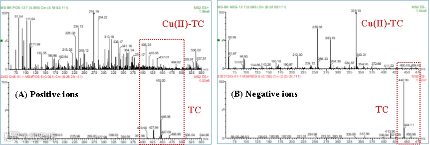 图2 TC单一溶液和Cu(II)-TC二元溶液的质谱分析。(A)正离子、(B)负离子