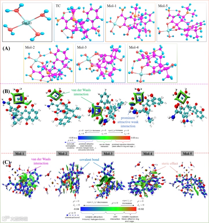 图1(A)可知,由于铜配合物的生成,在TC溶液中加入Cu(II),UV-Vis吸光度强度随Cu(II)的加入而降低,并呈现0:10>10:10>5:10>10:5>10:0([Cu(II)]:[TC])的趋势。图1(B)中,在30 ℃下静置24 h后,得到一种棕色溶液,被认为是Cu(II)-TC配合物,看起来与原始溶液完全不同,在80 ℃高温下结晶沉淀2 h,在Cu(II)-TC二元溶液中生成铜配合物。图2对比络合前后溶液的质谱证明铜配合物的生成。图3提出水溶液中Cu(II)与TC的络合反应式及铜配合物可能的分子结构。图4为Cu(H2O)2+、TC、其络合物的分子模型及基于IGMH和IRI计算得到的络合物形成的作用机制,其作用力主要包括:范德华力、显著的弱相互吸引、共价键作用及空间位阻等。
