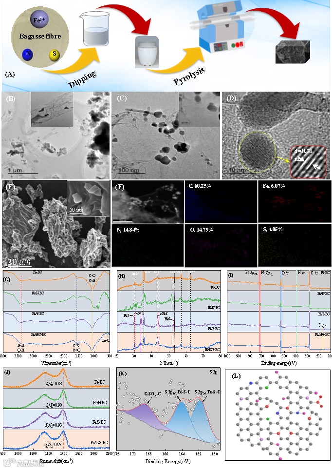 图5 浸渍-热解法制备MBCs的流程图(A),Fe/N/S-BC的TEM(B、C)、HR-TEM(D)、SEM(E)以及EDS能谱面扫(F),MBCs的FT-IR(G)、XRD(H)、XPS全谱(I)、Raman(J),Fe/N/S-BC中S2p的XPS精细谱(K)及可能的缺陷和共掺杂结构(L)