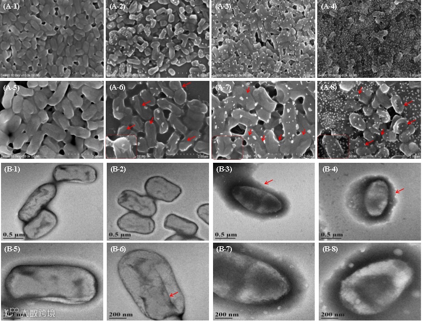 图12 未处理(A-1、A-5、B-1、B-5)及经Fe/N/S-BC(A-2、A-6、B-2、B-6)、PMS(A-3、A-7、B-3、B-7)和Fe/N/S-BC/PMS处理(A-4、A-8、B-4、B-8)的伤寒沙门氏菌的SEM(A)和TEM(B)图像