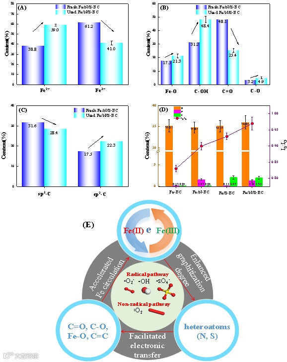 图8 新鲜和反应后Fe/N/S-BC中Fe2p(A)、O1s(B)、SP2-C和SP3-C(C)的含量,Fe-BC、Fe/N-BC、Fe/S-BC和Fe/N/S-BC中O、N、S的含量及石墨化程度(D),非均相Fe/N/S-BC/PMS体系的强化降解机制(E)