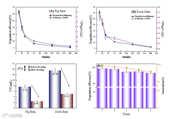 处理180min后,对养殖废水中TC的降解和失活率达到98%。养殖废水TOC分别降低了68%和62%,对TC和TRST的降解和失活效率分别保持在93.8%和91.6%(图16)。