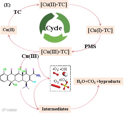 Cu(II)-TC二元体系中存在不饱和铜配合物能够分解PMS,其中,Cu(II)和TC中含N、O基团之间发生氧化还原反应生成不饱和Cu(I)-TC配合物,这一起始步骤在铜配合物中Cu2p的高分辨率XPS光谱中得到进一步证实;其次,Cu(I)与TC之间的络合键伸展可以加速电子转移,促进PMS与Cu(I)的反应,并通过双电子转移生成Cu(III)配合物;最后,不稳定的铜配合物被进一步分解,通过分子内电子转移(IET)生成Cu(II)和TC自由基(•TC),并进一步降解为中间体,最终氧化生成CO2、H2O、NH4+和副产物。由此可见,Cu(III)而非自由基在Cu(II)/PMS类Fenton体系中对TC的降解起主要作用(图7)。