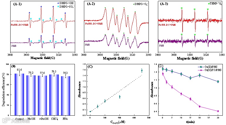 非均相Fe/N/S-BC/PMS体系的强化降解机制主要来源于Fe/N/S-BC中Fe(Fe(II)/Fe(III))循环的加速、含氧基团(C-O、C=O、Fe-O)促进了电子的转移以及杂原子(N、S)的掺杂提高了炭基催化剂的石墨化程度,图8。