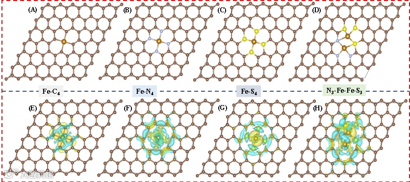 图9 通过自旋极化泛函计算Fe-BC(A、E)、Fe/N-BC(B、F)、Fe/S-BC(C、G)及Fe/N/S-BC(D、H)的电荷差密度