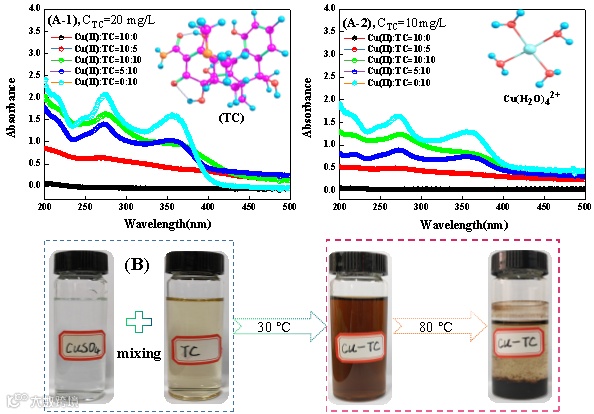 图1 Cu(II)-TC二元体系(A)的紫外-可见吸光光谱及铜配合物的生成(B)