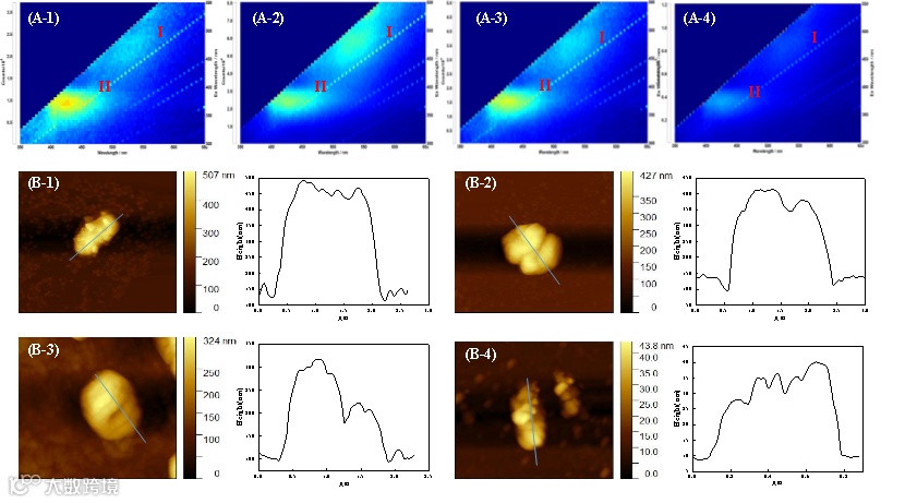 图13 未处理(A-1、B-1)及经Fe/N/S-BC(A-2、B-2)、PMS(A-3、B-3)和Fe/N/S-BC/PMS处理(A-4、B-4)的伤寒沙门氏菌的三维荧光(A)和原子力显微镜(B)图像