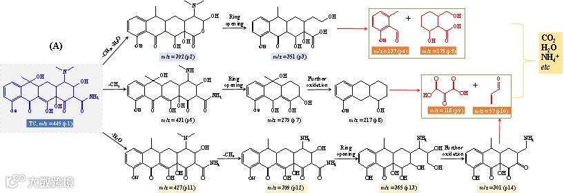 TC通过生成Cu(III)和ROS氧化引起的脱烷基、去羟基、脱酰胺、去甲基化、脱水、脱羰和开环等一系列反应降解,其中•SO4-、•OH和•O2-更容易攻击TC中的C-H、C-N、C=C和-NH2,而1O2更有选择性地吸引苯胺环和氨基结构,并且绝大部分中间产物具有更低的毒性(图10)。