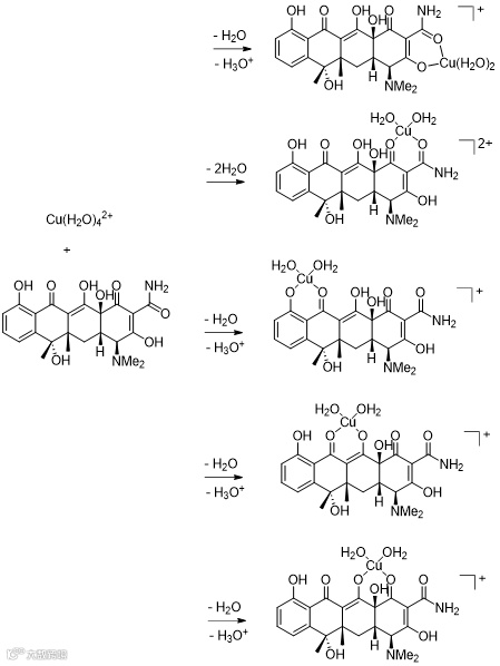 图3 水溶液中Cu(II)与TC的络合反应及铜络合物的分子结构