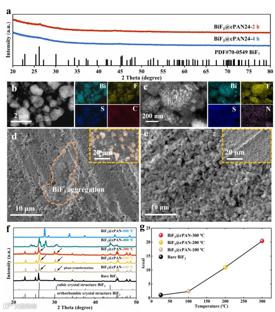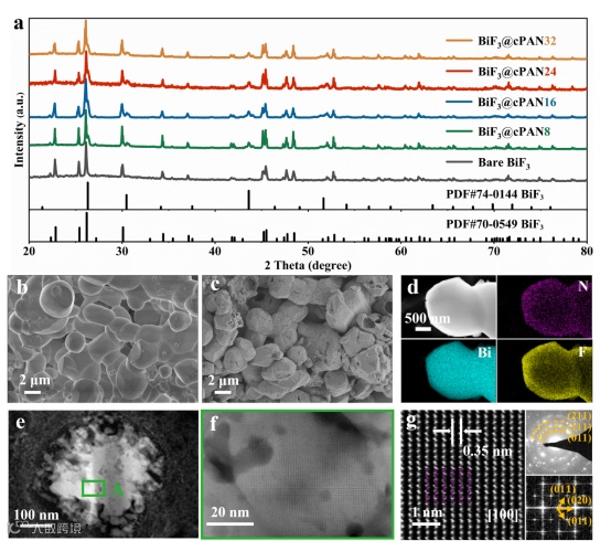 图2. 制备的微米尺寸BiF3@cPAN复合正极材料的形貌和结构分析