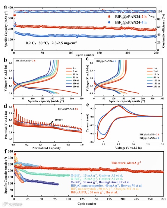 对所制备的复合材料进行了电化学性能测试。如图4所示,包覆样品在较短的球磨时间内获得了较高的放电容量。具体来说,研磨2小时的样品显示出330 mAh g-1的初始放电容量,并在250次循环后保持在200 mAh g-1的水平,库仑效率接近100%,达到了其理论容量的66%。因此采用BiF3@cPAN的ASSBs具有高容量、高稳定性和长循环寿命的突出特点,而之前的研究则显示出非常有限的比容量和快速的容量衰减。