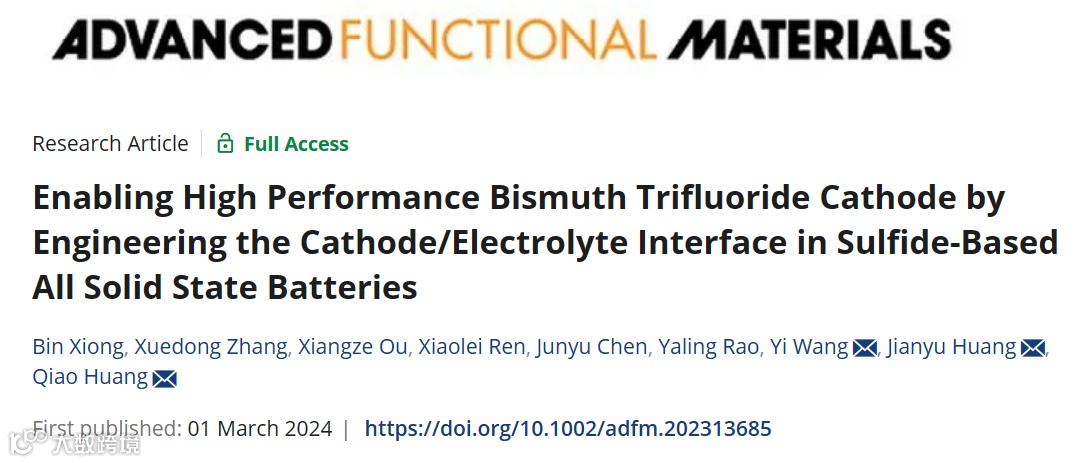 基于此,湘潭大学黄建宇教授、黄俏副教授与桂林电子科技大学王轶副教授合作,在国际知名期刊Advanced Functional Materials上发表题为“Enabling high performance bismuth trifluoride cathode by engineering the cathode/electrolyte interface in sulfide-based all solid state batteries”的研究性论文。