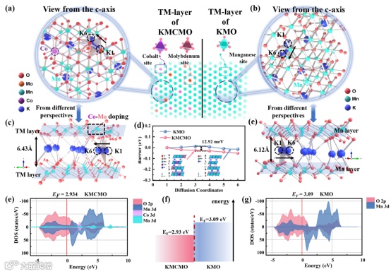 图5. KMCMO和KMO的DOS图与预测的迁移路径和迁移势垒。