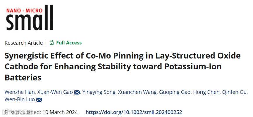 近日,来自东北大学的骆文彬教授团队在国际知名期刊Small上发表题为“Synergistic Effect of Co-Mo Pinning in Lay-structured Oxide Cathode for Enhancing Stability towards Potassium-Ion Batteries”的研究文章。该研究文章为了缓解由Jahn-Teller畸变和钾离子重复脱嵌引起的连续相变,在P3-K0.45MnO2中引入了[Mn-Co-Mo]O6八面体,优化了局域电子结构。基于实验和计算结果,[MoO6]八面体中心金属钼在相邻的[MnO6]八面体中以较小的离子半径和较高的氧化态诱导二阶JTE(伪JTE)畸变。这种畸变沿着c轴压缩了[MnO6]八面体,导致K+层的层间间距增加。同时,通过[CoO6]八面体平衡Mn3+/Mn4+,优化了K+扩散途径。因此,P3-K0.45Mn0.9Co0.05Mo0.05O2正极材料具有较好的循环稳定性和倍率性能。它在100mAh g-1和500mAh g-1的高容量分别为80.2 mAh g-1和77.3 mAh g-1。此外,它还展示了2000个周期的稳定性,容量保持率为59.6%。这项工作为锰基层状氧化物正极面临的挑战提供了一个具有指导意义的解决方案,并进行了深入的机制阐述。