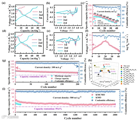 P3-K0.45Mn0.9Co0.05Mo0.05O2正极材料具有较好的循环稳定性和倍率性能。它在100mAh g-1和500mAh g-1的高容量分别为80.2 mAh g-1和77.3 mAh g-1。此外,它还展示了2000个周期的稳定性,容量保持率为59.6%。
