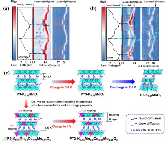 图4. 对应于P3-KMCMO和KMO第一次和第二次充放电过程中原位XRD二维图和结构演化示意图。