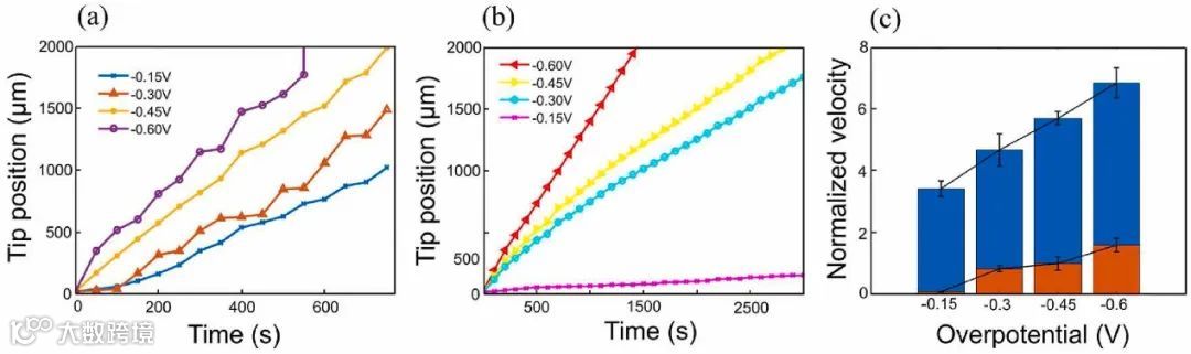 图3. 不同过电势下枝晶尖端位置的空间分布和生长速度