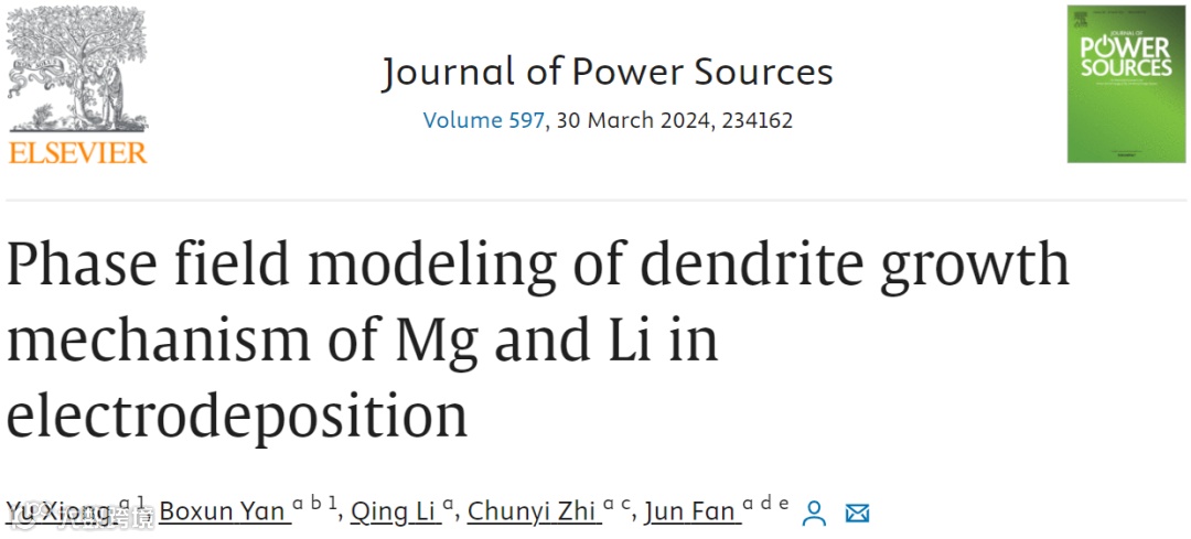 近日,来自香港城市大学的范俊教授在国际知名期刊Journal of Power Sources上发表题为“Phase field modeling of dendrite growth mechanism of Mg and Li in electrodeposition”的观点文章。该观点文章开发了先进的相场模型来研究锂和镁枝晶的沉积过程,并阐述了不同枝晶的生长差异。