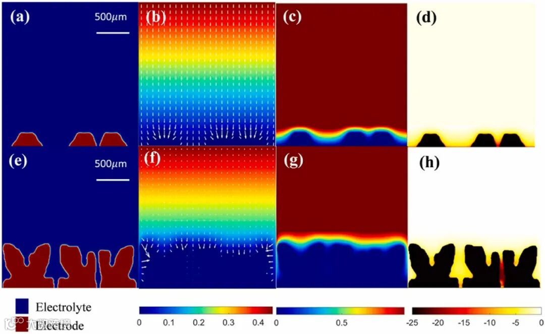 锂枝晶的生长随着时间的推移而不断变化,呈现出不规则的树状图案,树枝自由且不对称地生长。在沉积初期,锂电极和电解质之间形成了具有浓度梯度差异的15-20 μm的区域。然而在300s时,锂枝晶尖端周围形成了较高离子浓度的区域。高离子浓度的分布加速了锂枝晶的生长,起到正反馈作用。镁表现出的沉积形貌与锂的沉积形貌相差较大:分支结构明显更少,更短。此外,沉积镁附近的电场强度分布与锂枝晶尖端产生局部增强的电场不同,表现出更大的均匀性。因此,在沉积的早期阶段形成更致密和光滑的镁沉积表面导致在电场存在下离子浓度的分布更均匀。同时沉积界面处离子浓度的均匀分布减轻了不同方向上离子聚集,从而防止了界面处的正反馈和沿垂直方向的枝晶生长。