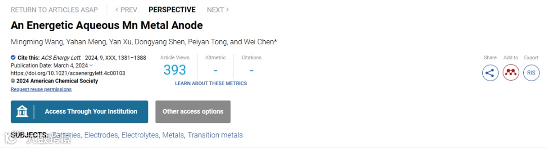 An Energetic Aqueous Mn Metal AnodeMingming Wang, Yahan Meng, Yan Xu, Dongyang Shen, Peiyan Tong, and Wei Chen*ACS Energy Lett. 2024, 9, 1381–1388