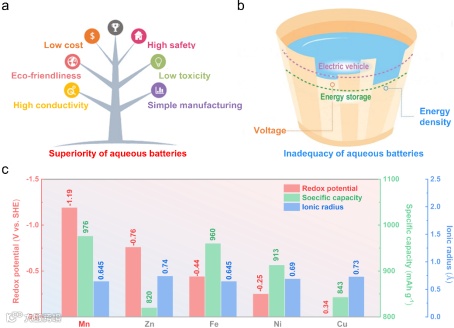 图1. 水系锰金属负极的研究意义。水系电池的优势(a)和不足(b),锰金属负极和其他水系金属负极的氧化还原电位、理论比容量和离子半径对比(c)。
