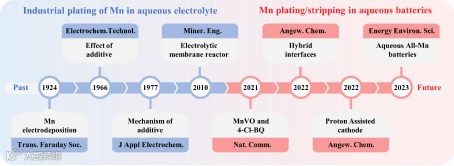 图3. 水溶液中电沉积锰金属和水系锰金属电池的发展历史。