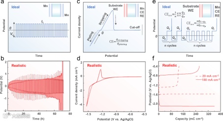 图4. 水系锰金属负极推荐的测试方法,以及水系锰金属负极理论上和目前现实中的电化学性能表现。