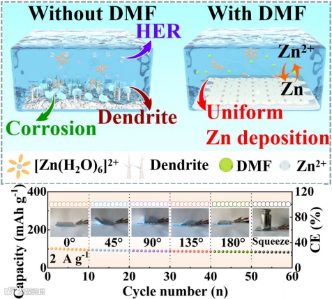 锂离子电池的发展一直受到锂资源短缺、成本高和热失控问题的制约。近年来,锌基水系电池(AZBs)因其优异的安全性、较高的理论容量(820 mAh g-1, 5855 mAh cm-3)、丰富的储量、适宜的氧化还原电位(相对于标准氢电极(SHE) -0.76 V)和较低的成本而受到研究人员的青睐。不幸的是,在电镀/剥离过程中,不规则的Zn沉积导致刚性枝晶的形成,加剧了活性位点分布的不均匀,使隔膜更容易被刺穿,从而导致电池短路。当电解质溶液中只有水作为溶剂时,H2O继续不可逆地消耗电子,在阳极表面产生氢气,最终使整个电池的库仑效率(CE)和循环寿命恶化。