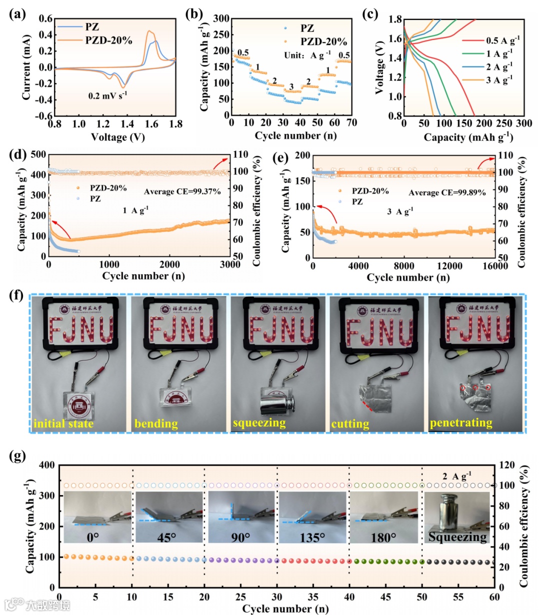 为了测试PZD在实际应用中的能力,使用含有DMF的电解质组装Zn||MnO2全电池,在3 A g-1电流密度下循环达到16000圈,且使用软包电池在不同的弯折角度以及重物和剪切的条件下能够点亮灯牌并且维持电池稳定循环,证明PZD水凝胶电解质实际应用的可行性。