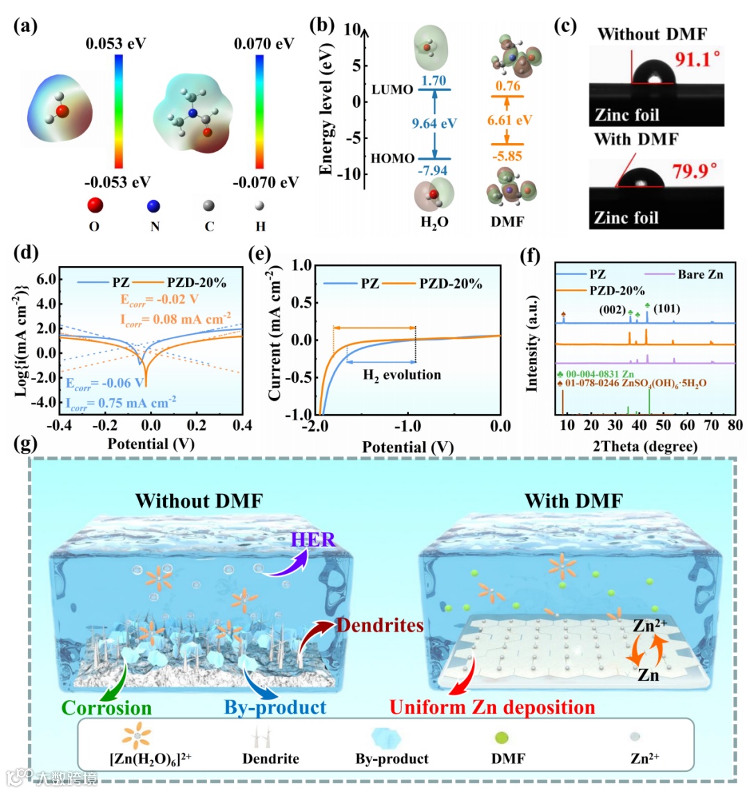 静电势(ESP)首先显示出DMF与水分子相比具有更强的负静电势和更高的HOMO能级,这表明DMF与Zn2+具有更强的吸引力,并在Zn阳极表面经历电子转移,以更好地进行化学吸附,从而抑制水分子与Zn阳极接触,引导Zn2+沉积。