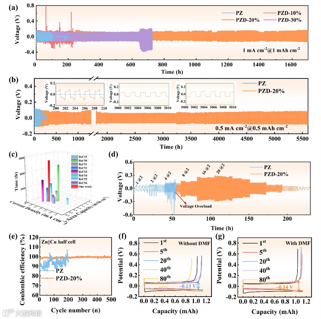PZD-20%构筑稳定的锌电极表面微环境,抑制枝晶生长及与水相关的副反应,提高锌电极的沉积/剥离可逆性、大电流性能。使用PZD-20%凝胶电解质,在0.5 mA cm-2电流密度下,Zn||Zn对称电池的循环寿命可达到5600小时,在1 ~ 20 mA cm-2的电流密度下Zn||Zn对称电池也展现出良好的倍率性能。添加DMF后成核过电位增大,Zn2+以小核沉积,沉积更加致密,抑制枝晶生长,减缓Zn2+溶剂化动力学。