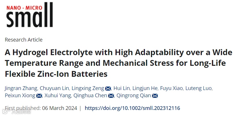 近日,福建师范大学陈庆华教授、钱庆荣研究员和曾令兴教授联合德国德累斯顿工业大学熊佩勋博士报道了一种基于极性非质子溶剂N,N-二甲基甲酰胺(DMF)的二元混合溶剂(H2O-DMF)制备含ZnSO4(ZS)的聚丙烯酰胺(PAM)基凝胶电解质(简称PZD)。该凝胶电解质组装成全电池展现出良好的柔性性能和优异的宽温域电化学性能。该工作为开发可穿戴柔性功能鞋服器件的设计提供了新思路。