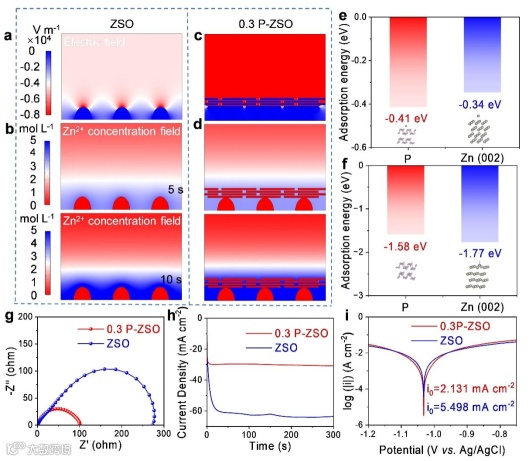 图4 ZSO(a)和0.3 P-ZSO(c)电解液中的电场分布以及ZSO(b)和0.3 P-ZSO(d)电解液的Zn2+浓度梯度分布。Zn2+-BP和Zn2+-锌电极(002)晶面的相互作用能(e)以及H+-BP和H+-锌电极(002)晶面的相互作用能(f)。分别基于ZSO和0.3 P-ZSO电解液组装的Zn//Zn对称电池的Nyquist图(g)及计时电流法曲线(h)。锌电极在ZSO和0.3 P-ZSO电解液中的Tafel图(i)。