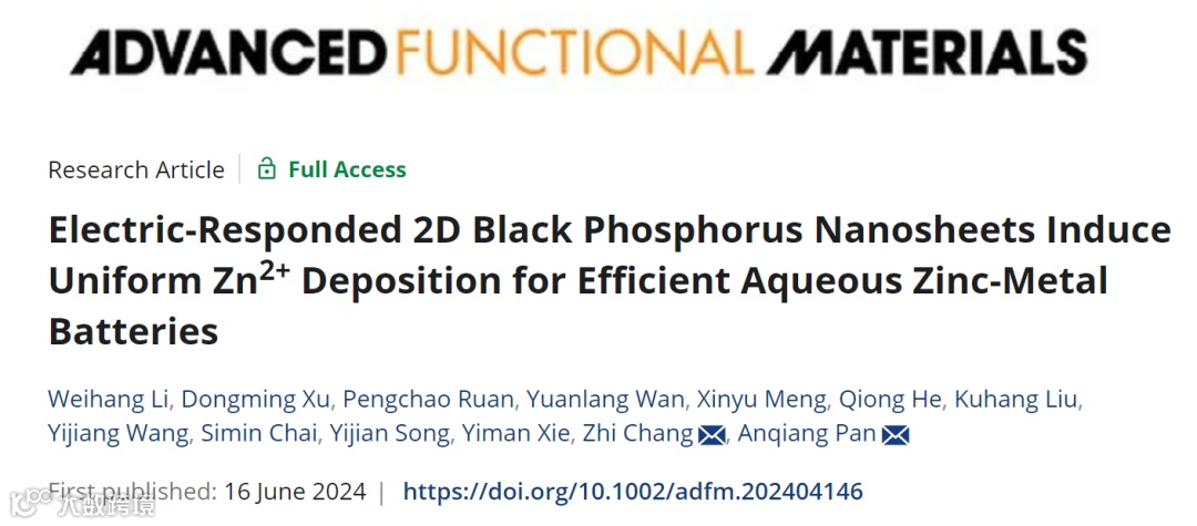 近日,来自中南大学、新疆大学的潘安强教授与中南大学的常智教授合作,在国际知名期刊Advanced Functional Materials上发表题为“Electric-responded Two-dimensional Black Phosphorus Nanosheets Induce Uniform Zn2+ Deposition for Efficient Aqueous Zinc-metal Batteries”的文章。该论文使用二维黑磷(BP)纳米片作为添加剂对水系电解液进行改性。二维BP纳米片具有独特的电子定向迁移特性,因此在电场作用下,BP纳米片能够迅速迁移至电极表面屏蔽“尖端效应”。