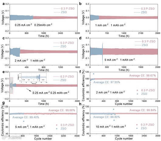 图2 分别基于ZSO和0.3 P-ZSO电解液组装的Zn//Zn对称电池在0.25 mA cm-2和0.25 mAh cm-2(a),1 mA cm-2和1 mAh cm-2(b)、2 mA cm-2和1 mAh cm-2(c)及5 mA cm-2和1 mA cm-2(d)条件下的长循环性能及倍率循环性能(e)。分别基于ZSO和0.3 P-ZSO电解液组装的Zn//Cu电池在2 mA cm-2和1 mAh cm-2(f)、5 mA cm-2和1 mA cm-2(g)及10 mA cm-2和1 mAh cm-2(h)的条件下的CE。