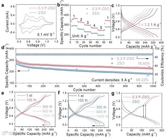 图5 分别基于ZSO和0.3 P-ZSO电解液组装的Zn//NVO全电池的CV曲线(a)及倍率性能(b)。基于0.3 P-ZSO电解液组装的Zn//NVO全电池在不同电流密度下的GCD曲线(c)。在5 A g-1的电流密度下,基于ZSO和0.3 P-ZSO电解液组装的Zn//NVO的长循环性能(d)。在5 A g-1的电流密度下,基于0.3 P-ZSO(e)和ZSO电解液(f)组装的Zn//NVO全电池的电压分布。在5 A g-1的电流密度下,基于ZSO和0.3 P-ZSO电解液组装的Zn//NVO全电池的逐步电压分布(g)。