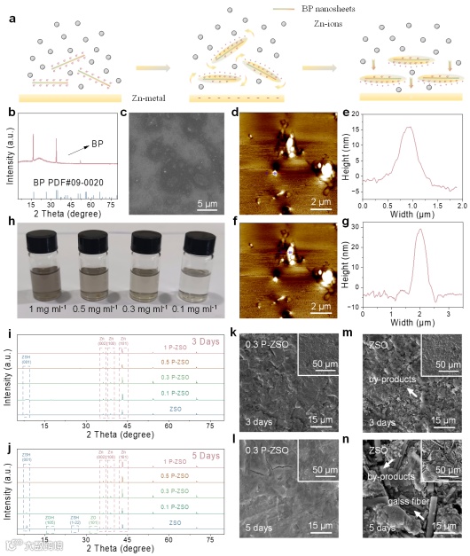图1 BP在电场下的吸附行为及其诱导Zn2+的沉积行为的示意图(a)。2D-BP的XRD图谱(b),SEM图像(c),AFM图像(d,f)及高度分布(e,g)。0.1、0.3、0.5和1 P-ZSO的数字照片(h)。锌电极在不同电解液中浸泡3天(i)和5天(j)后的XRD图谱。搁置3天(k)和5天(l)之后从0.3 P-ZSO电解液收集的锌电极的SEM图像,以及搁置3天(m)和5天后(n)从ZSO电解液收集的锌电极的SEM图像。