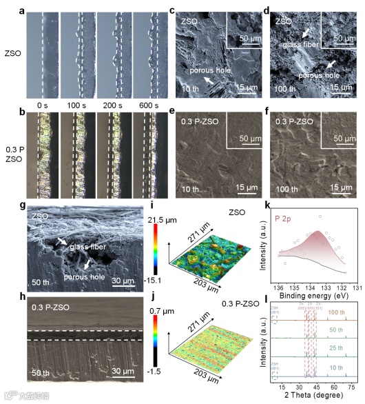图3 ZSO(a)和0.3 P-ZSO(b)电解液中锌沉积的原位光学观察照片。在1 mA cm-2和1 mAh cm-2下10次循环(c)和100次循环(d)后基于ZSO电解液的锌电极的SEM图像。在1 mA cm-2和1 mAh cm-2下10次循环(e)和100次循环(f)后基于0.3 P-ZSO电解液的锌电极的SEM图像。50次循环后基于ZSO(g)和0.3 P-ZSO电解液(h)的截面SEM图像。在1 mA cm-2和1 mAh cm-2下50次循环后基于ZSO(i)和0.3 P-ZSO电解液(j)的锌电极的3D高度图像。50次循环后基于0.3 P-ZSO电解液的锌电极表面的P 2p XPS拟合(k)。不同循环后,在1 mA cm-2和1 mAh cm-2下从0.3 P-ZSO电解液收集的锌电极的XRD图谱(l)。