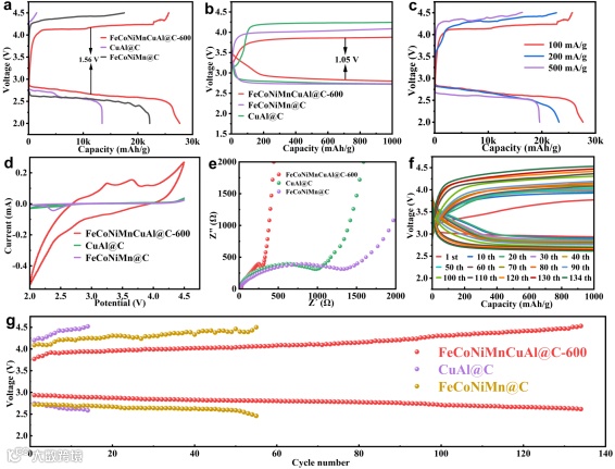 FeCoNiMnCuAl@C-600的催化作用在倍率和循环性能上也得到了验证。FeCoNiMnCuAl@C-600在100 mA g-1的电流密度下可以实现27664 mAh g-1,同时在电流密度100 mA g-1以及定容1000 mAh g-1时,可以实现超过130次循环,过电位约为1.05 V。此外,通过循环伏安法(CV)可以观察到,FeCoNiMnCuAl@C-600在阳极区出现了三个峰,多个氧化峰的出现可能源于HEAs的多个活性位点对Li2CO3的分解能力差异。