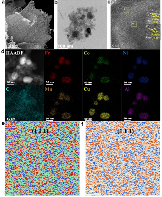 扫描电子显微镜(SEM)显示FeCoNiMnCuAl@C-600呈现明显的片状分级结构。高分辨扫描透射电子显微镜(TEM)显示出各种金属元素均匀分布。此外,通过几何相位分析(GPA)可以观察到,在HEAs分层纳米片中普遍存在大量的晶格畸变和剧烈的内部拉伸和压缩应力,这可以合理地源于Fe、Co、Ni、Ni、Mn、Cu和Al组成元素的原子半径和电负性差异。